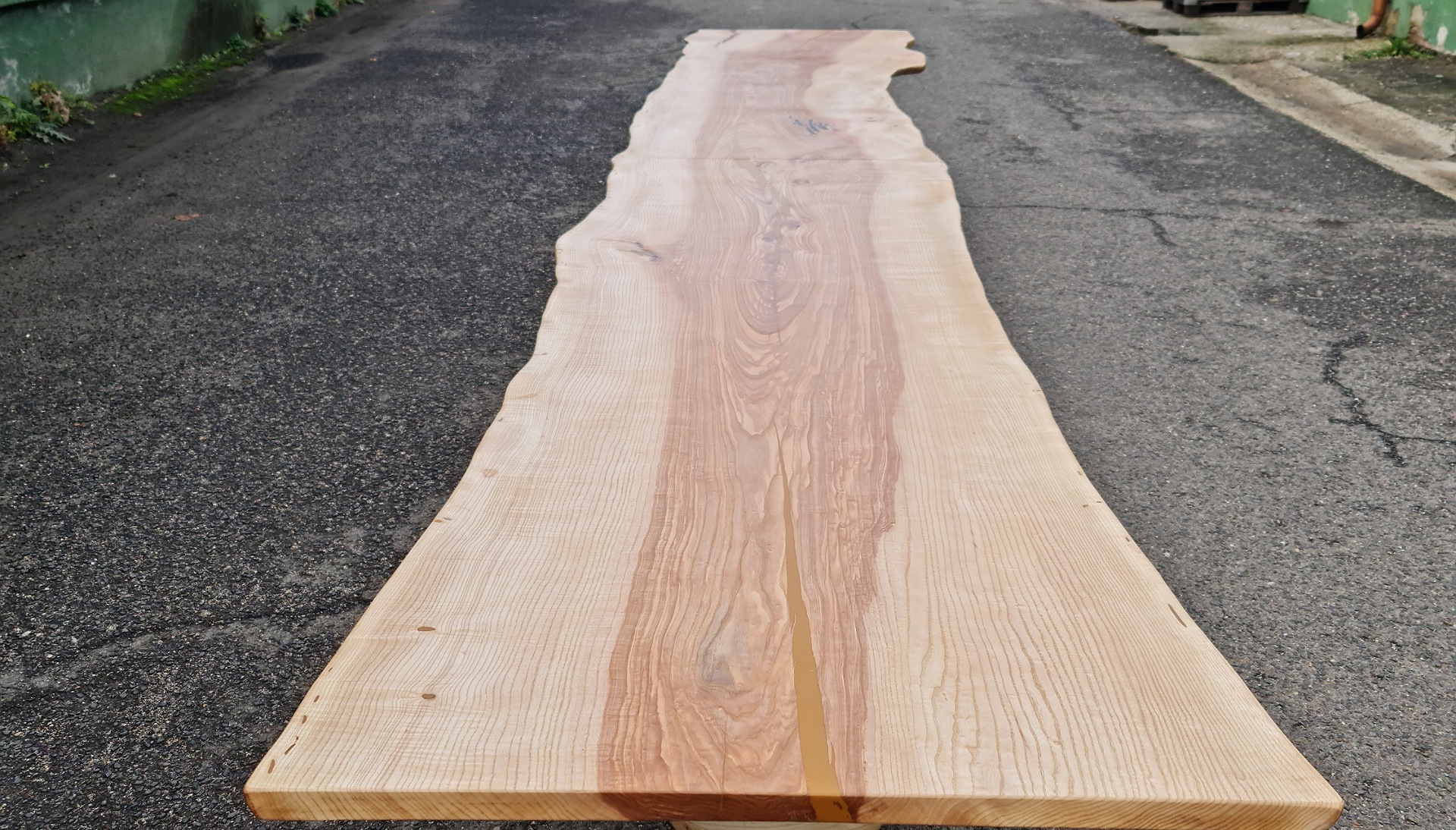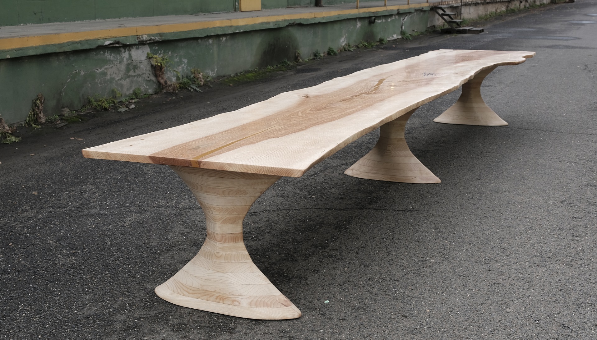 If we look at it from the very beginning, this table has won all the trophies in terms of time and energy. In terms of cutting up the raw material, bringing it home, drying it and the hours of work involved, it is a project of almost a year and many hundreds of kilometers. Angelas new and most patinated member of all our tables so far is this huge ash, ark-sized, 6 meters long and 1 meter wide, for 22 people, made of one sheet, can be disassembled into 2 parts (with paper-thin joints). Specially for this project, we designed our type of legs named Magnum, which consumed 1.5 cubic meters of ash wood before they were assembled and tortured the backs, shoulders and arms of several people to the level of a chiropractor before they were finished in their polished shine. On behalf of both of us, I can say that this table contains all the knowledge and experience we have acquired so far. We were really looking forward to the birth of the first of the 5 numbered copies.