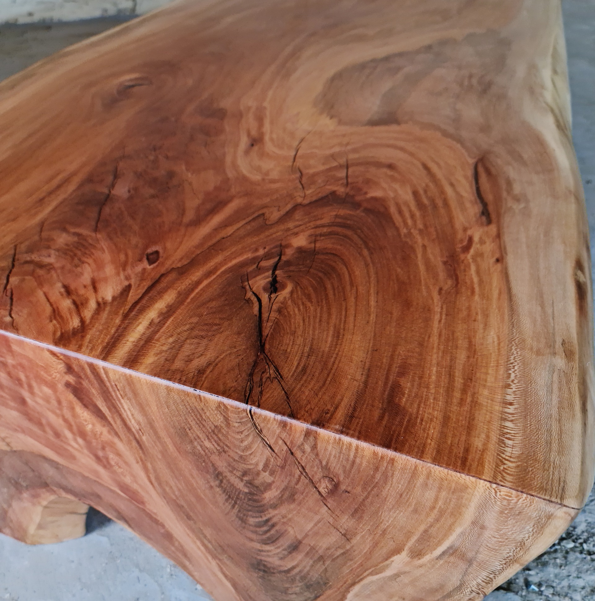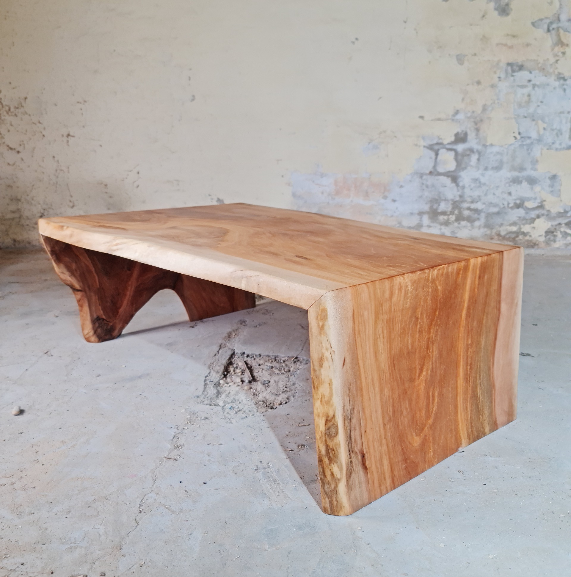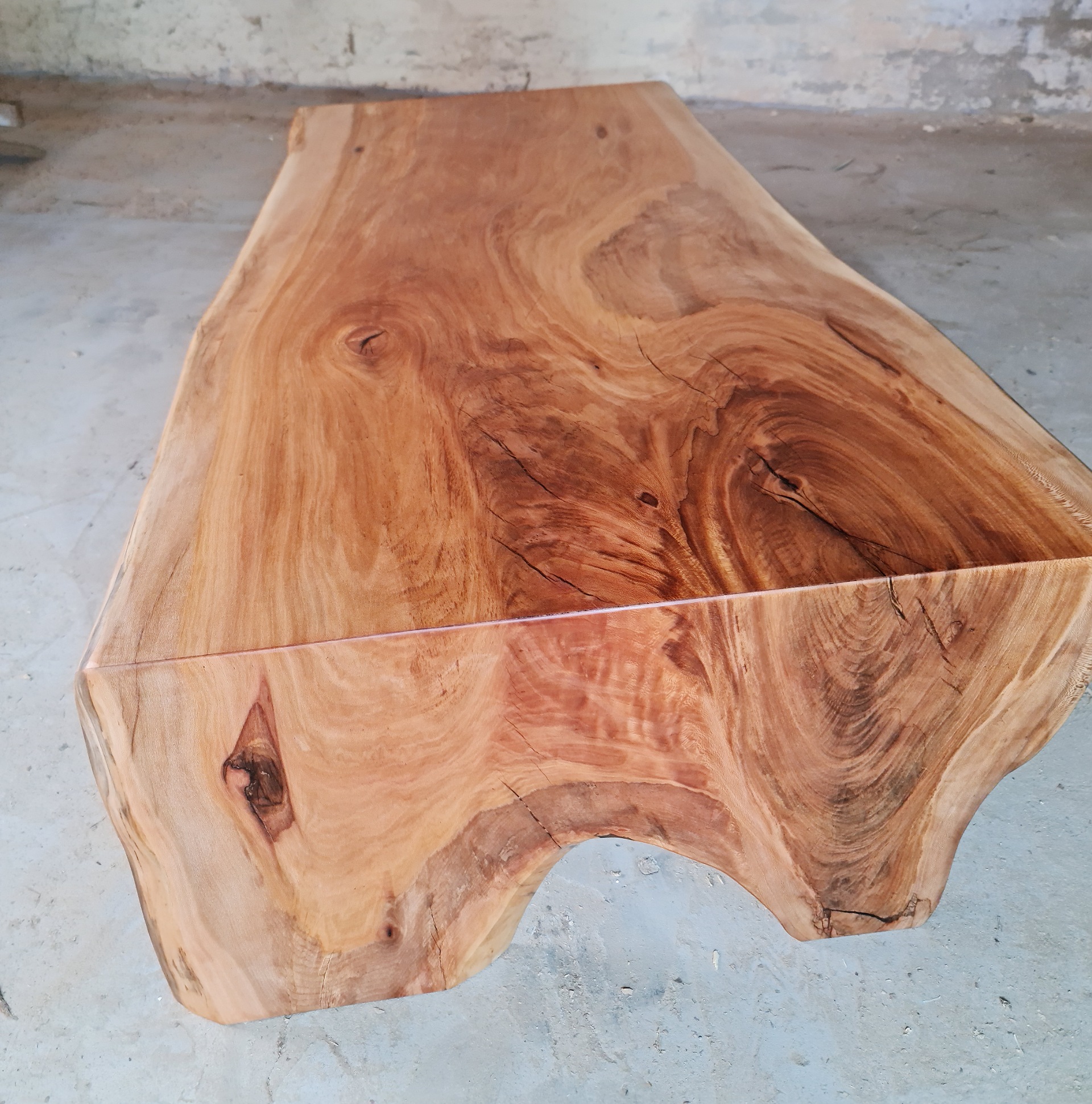 Sophie from a true rarity. The tree on which it is based is a nearly 300-year-old sycamore tree, which fell on one of the hotels on Margarett Island as a result of a strong storm in May 2021, causing serious damage. Todays Sophie was born from one of the thicker branches of this tree. Another impudently rare interesting thing is that during its preparation we discovered a very interesting black spot, which when I opened, revealed itself to us as an ugly memory of history. There is a 1956, 4-5 cm splinter drilled into the tree, which has grown nicely around the tree over the years. This splinter can be felt in its entirety at the bottom of the table. The sight itself is amazing live. The Y branch, which gives the legs in this case, produces incredible patterns and drawings. A combination of burgundy, dark brown, light brown and reddish colors, speckled with wonderful, scale-like motifs in the strapwork. She is my favorite Sophie so far. It has everything I love in a tree.